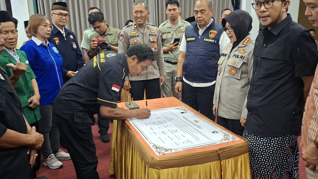 Sebagai simbol komitmen bersama, seluruh peserta mengikuti pembacaan deklarasi damai yang dipimpin langsung oleh Dirbinmas, dilanjutkan dengan penandatanganan deklarasi oleh perwakilan ormas yang hadir.