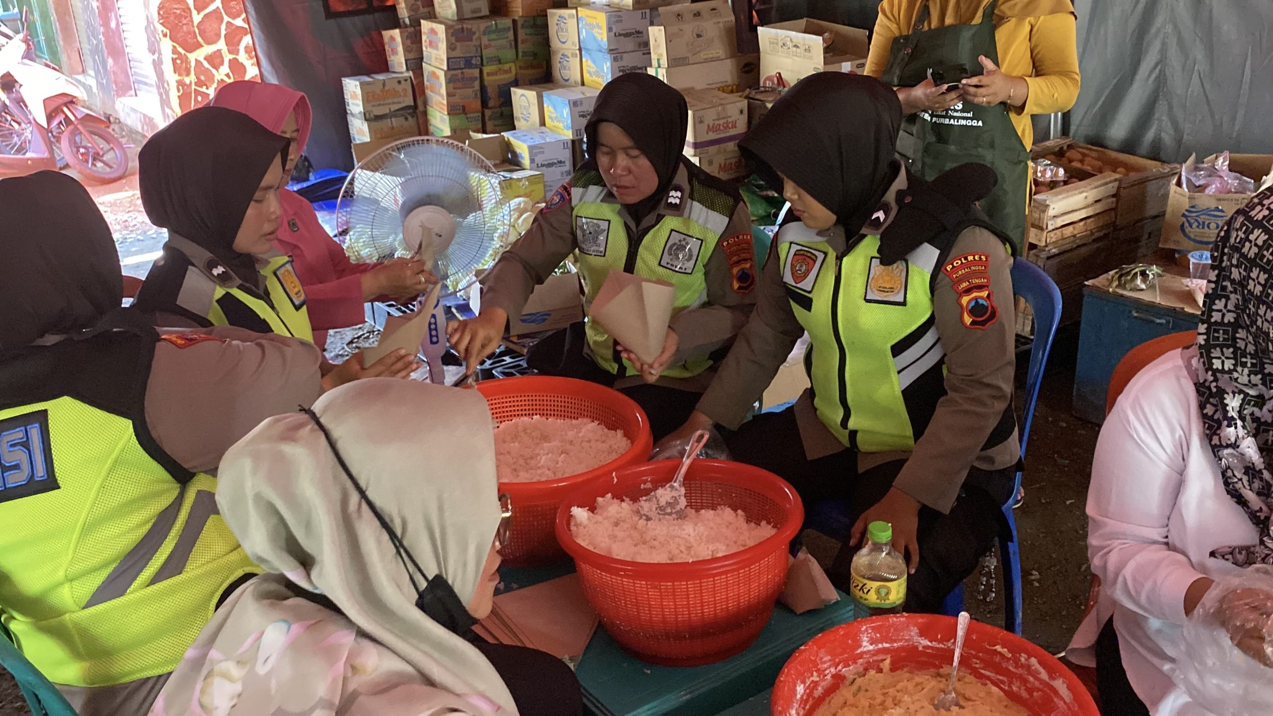 Di dapur umum yang didirikan BPBD Kabupaten Purbalingga, para Polwan turut membantu proses memasak kebutuhan makan warga sehari-hari. Aktivitas ini menjadi wujud gotong royong lintas unsur untuk memastikan kebutuhan dasar warga tetap terpenuhi.