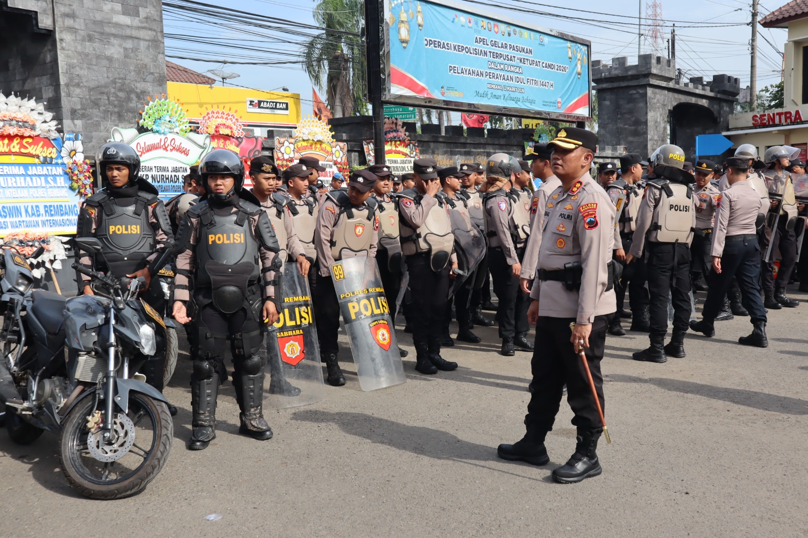 Apel diikuti oleh jajaran personel Polres Rembang yang terlibat dalam pengamanan, di antaranya Wakapolres Rembang Kompol Agunging Tyas Widya Aryani, S.Si., S.I.K., para Pejabat Utama (PJU), Kapolsek jajaran, serta personel Dalmas, Raimas, dan tim penegakan hukum.