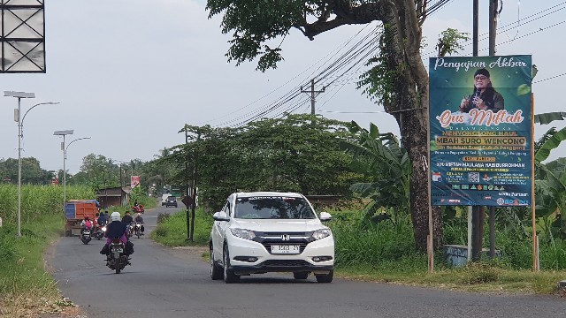 MERIAH: Banner Pengajian Gus Miftah dalam rangka Mbah Surgi Suro Wencono Penggung, terpasang di salah satu titik di Desa Ngagel, Kecamatan Dukuhseti kemarin.