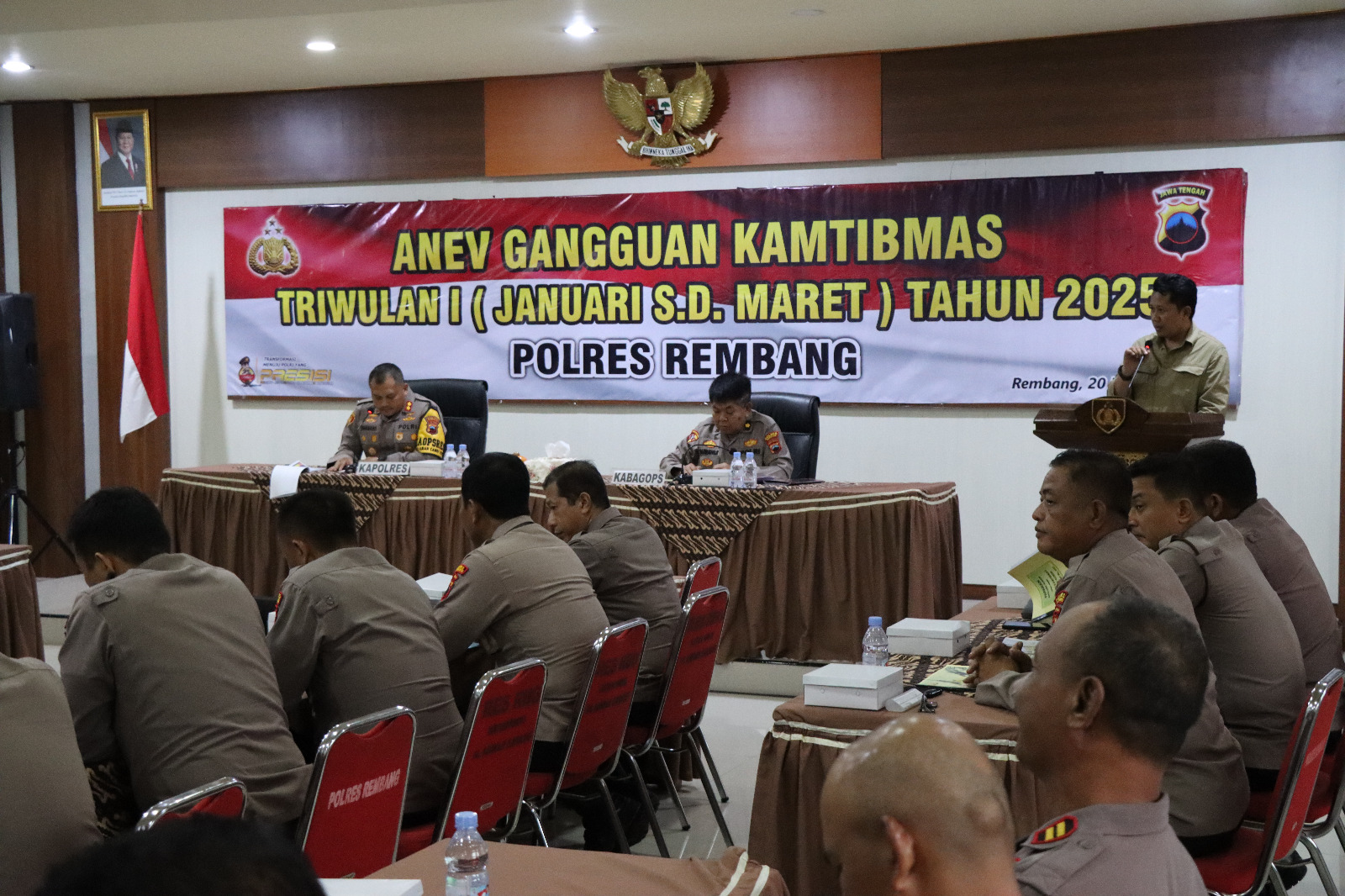 Hadir dalam Rapat Analisa dan Evaluasi Gelar Operasional Triwulan Satu Tahun 2025 ini para Kabag, Kasat, Kasi, Kapolsek jajaran Polres Rembang.