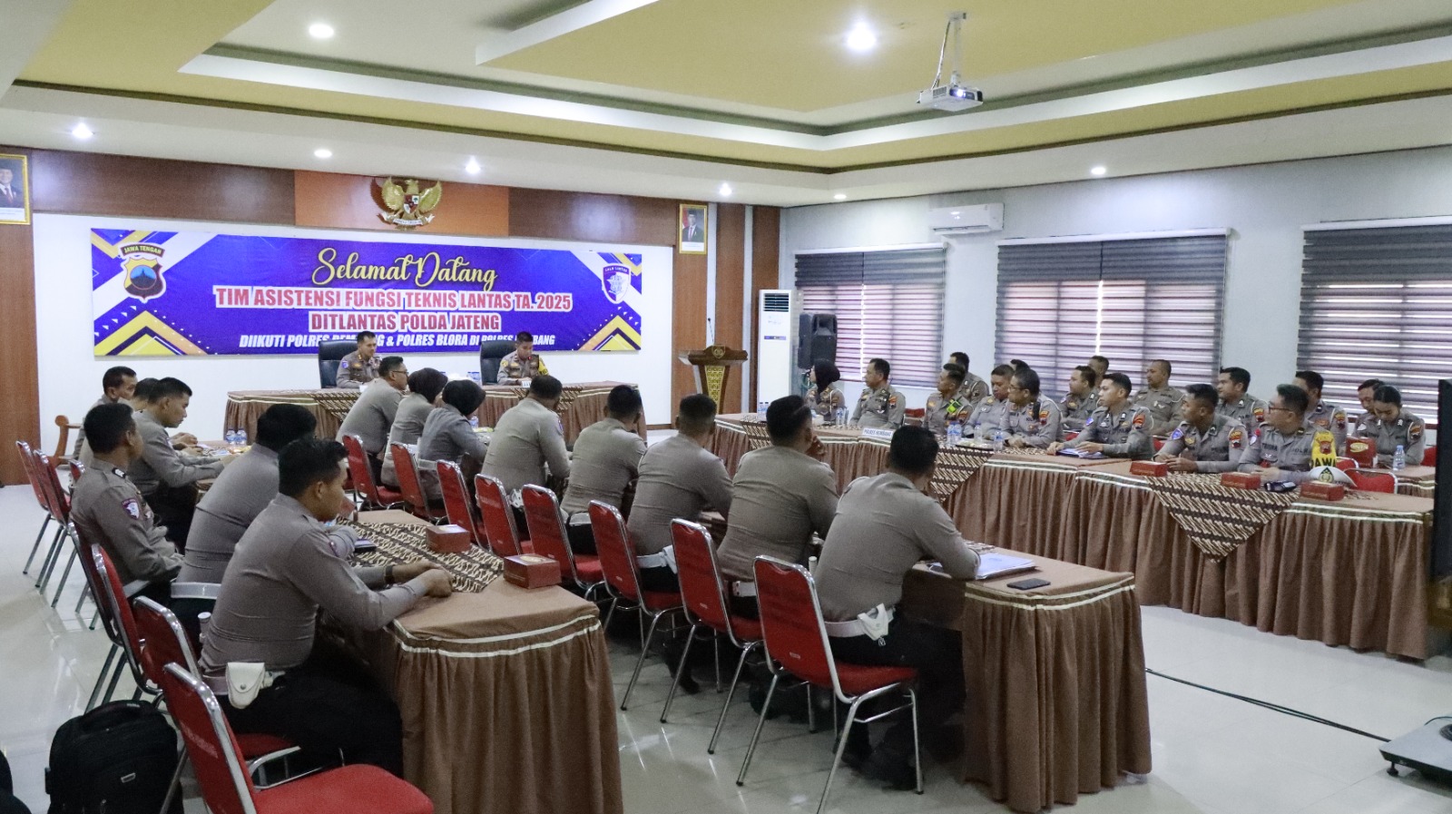 REMBANG – Tim Asistensi fungsi teknis Lantas Direktorat Lalu Lintas (Ditlantas) Kepolisian Daerah Jawa Tengah melakukan kunjungan kerja (kunker) ke Polres Rembang. Kegiatan ini di ikuti oleh Polres Rembang dan Polres Blora bertempat di Aula Sarja Arya Racana Mapolres Rembang, Kamis (15/5/2025) siang.