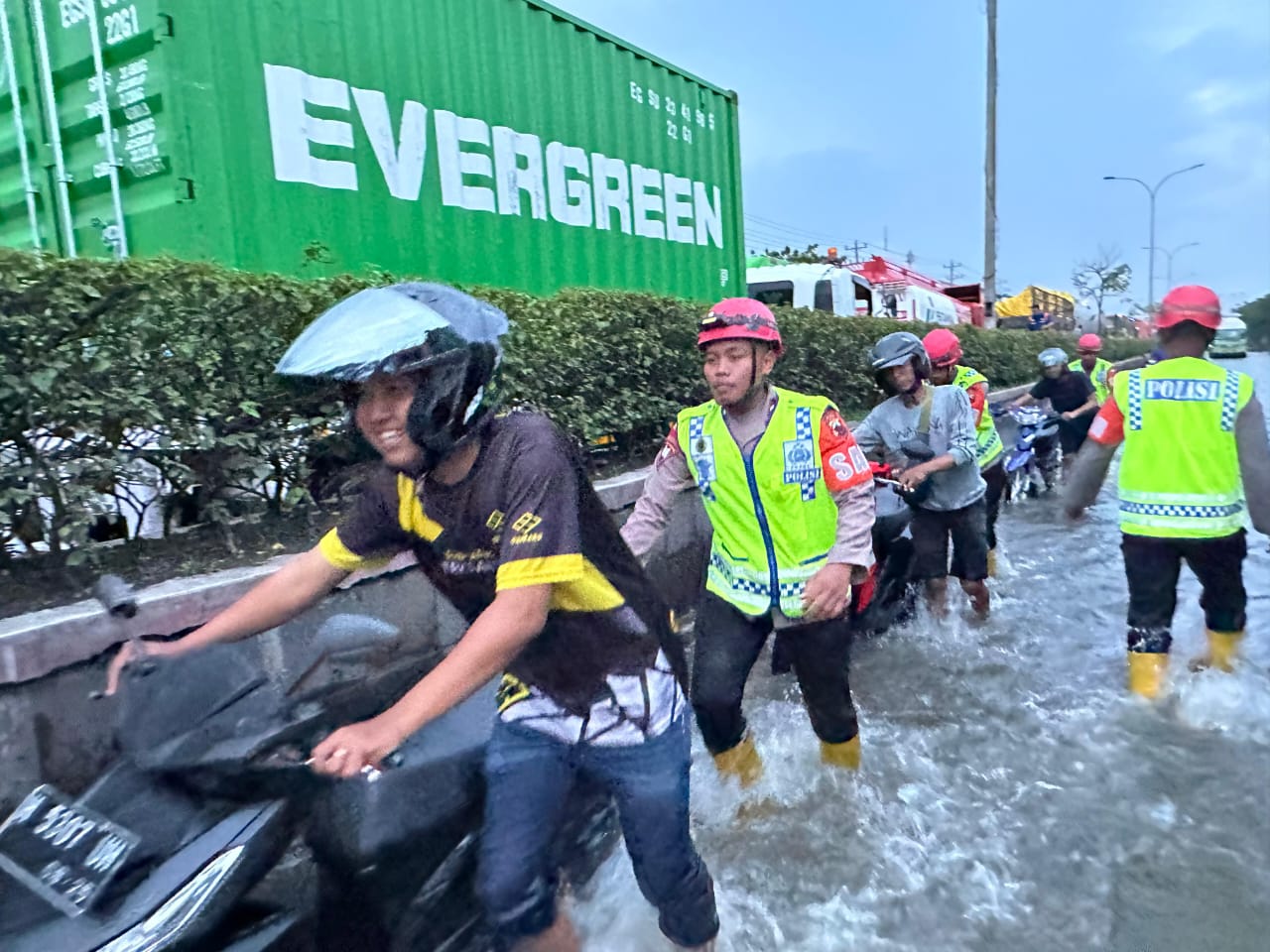 Setibanya di lokasi, para personel tersebut langsung melakukan pengaturan lalu lintas untuk mencegah kemacetan panjang, membantu mendorong sepeda motor warga yang mogok, serta memberikan bantuan evakuasi menggunakan truk bagi warga yang kesulitan menembus genangan air.