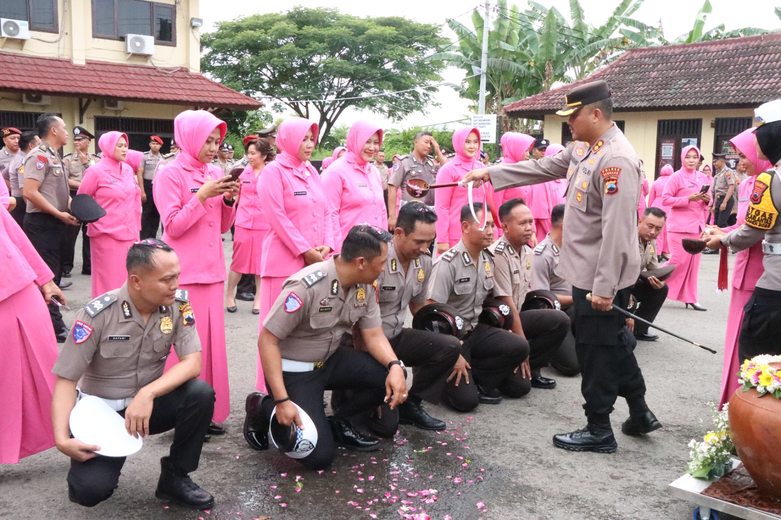 Salah satu momen yang penuh makna adalah prosesi penyiraman air bunga kepada personel yang naik pangkat, dipimpin langsung oleh Kapolres Rembang dan diikuti oleh para Pejabat Utama.