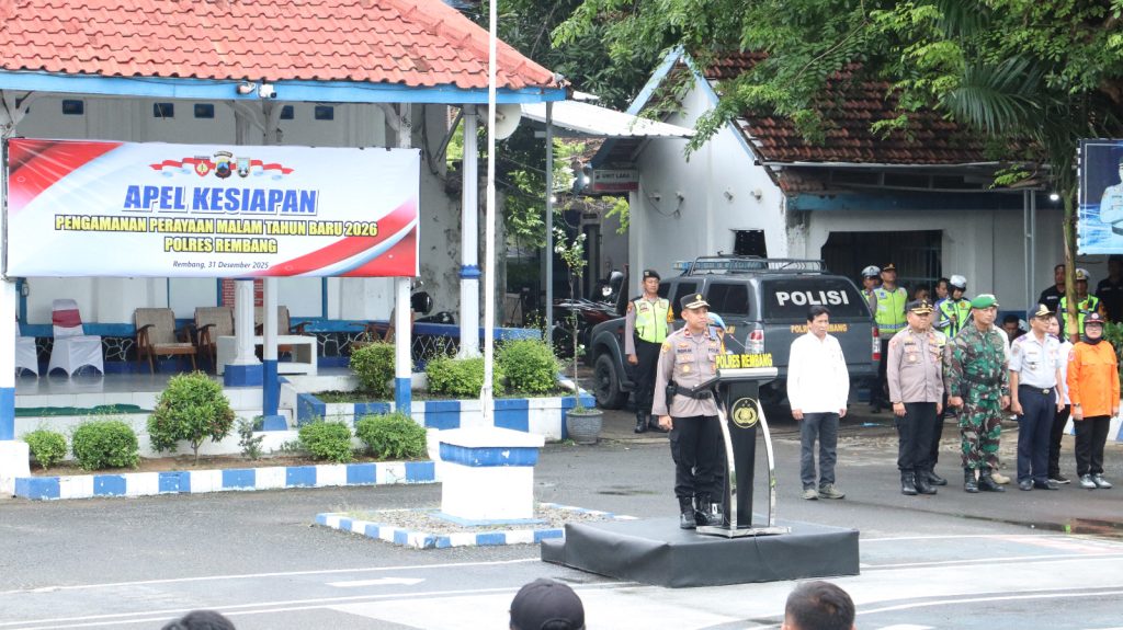 Rembang – Polda Jateng | Wakapolres Rembang Kompol M. Fadhlan, S.H., S.I.K., M.H., memimpin apel kesiapan pasukan dalam rangka pengamanan perayaan malam tahun baru 2026 yang digelar di halaman Mako Satlantas Polres Rembang, Rabu (31/12/2025) sore.